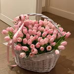 A beautiful, impressive basket of tulips. The photo shows 65 tulips