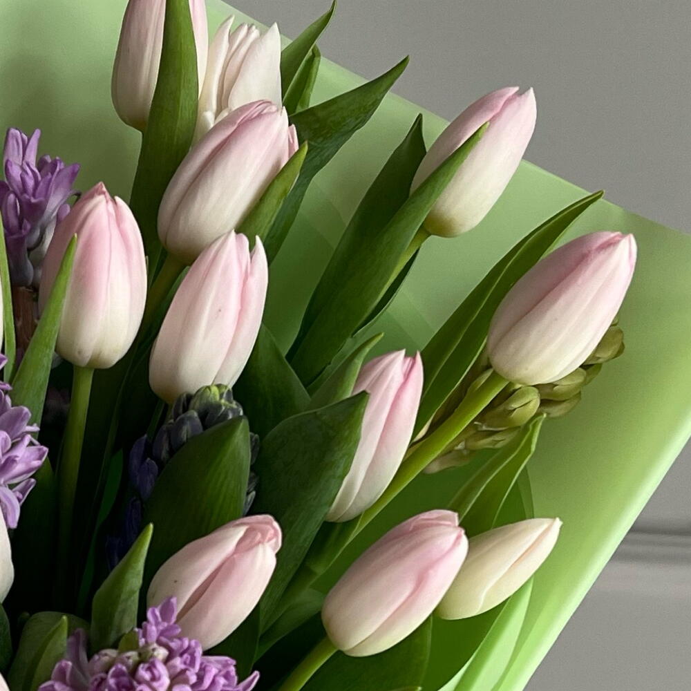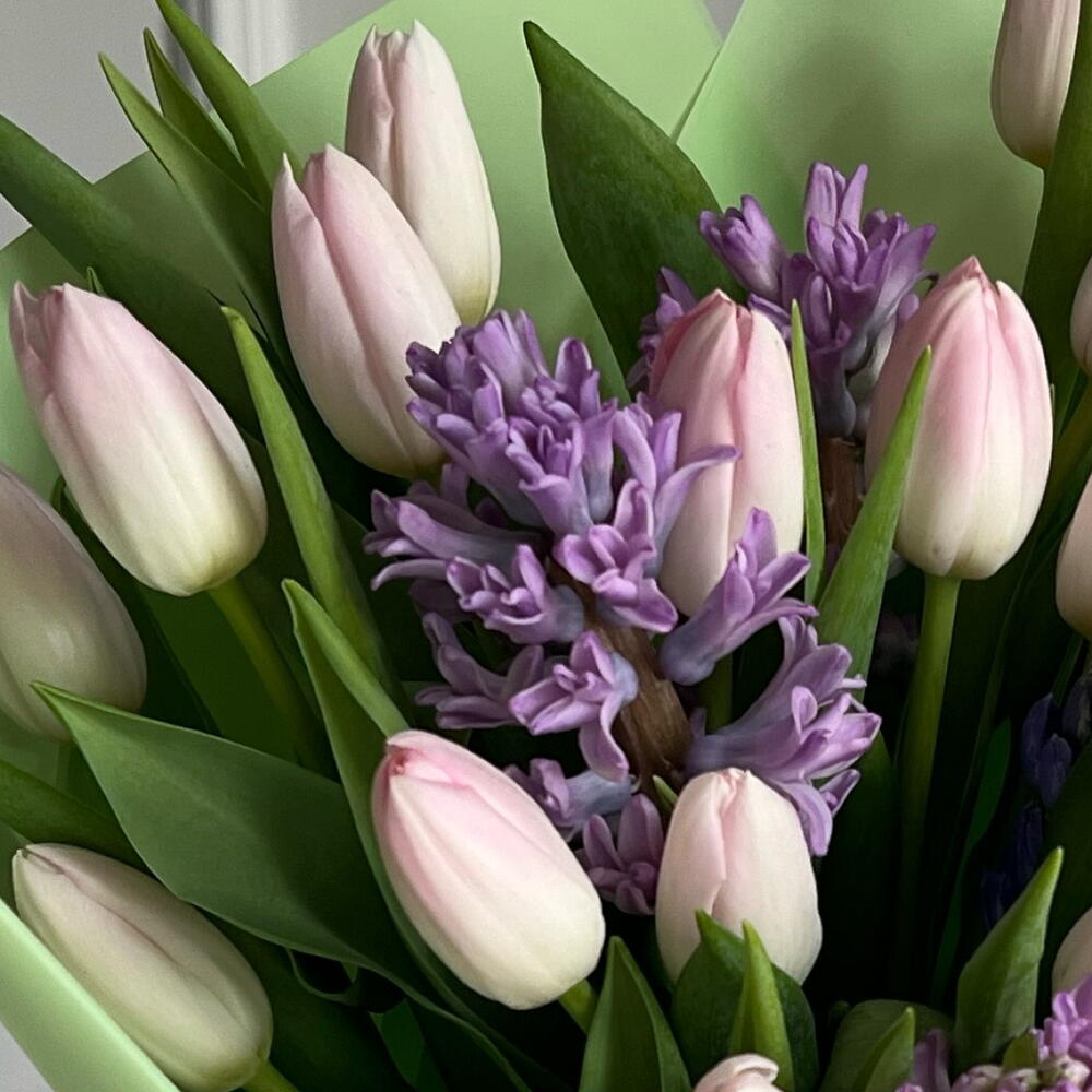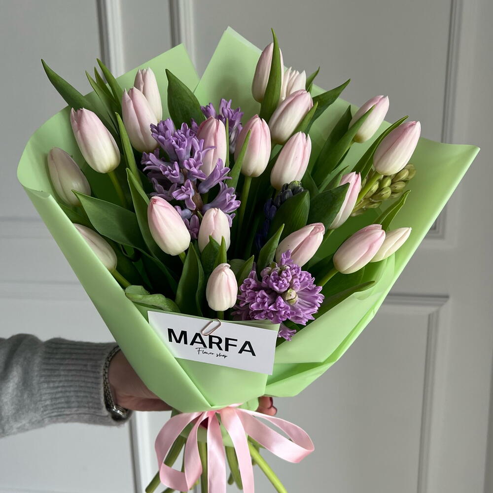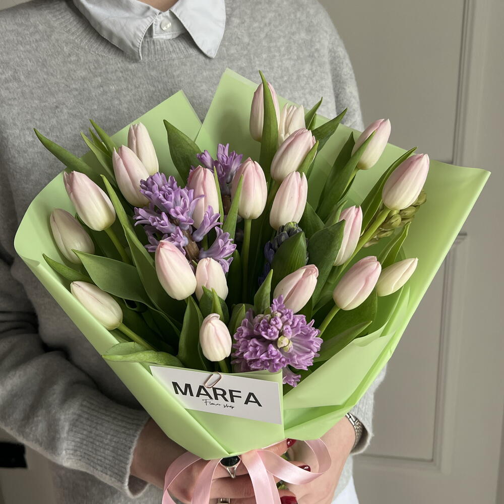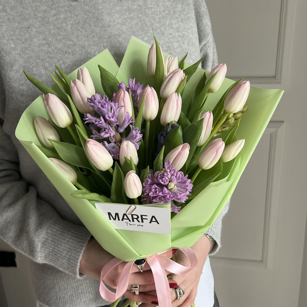 A neat and dense bouquet of crispy tulips and fragrant hyacinths.