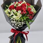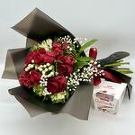 gipsofila - 4 pcs white hypericum - 3 pcs red astromeria - 3 pcs red rose equcdor - 7 pcs white astromaria - 3 pcs rafaello chocolate box - 1 pcs