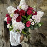 Hydrangea - 5 pcs Lisianthus - 5 pcs roses - 20 pcs folliage - 10 pcs