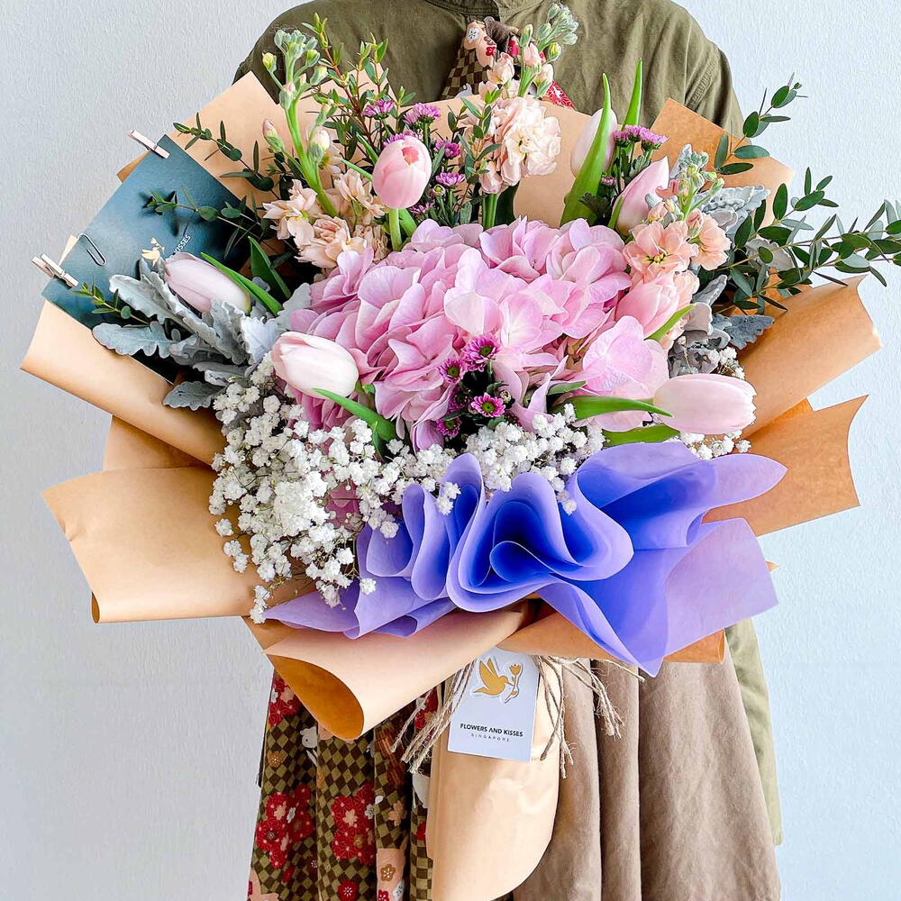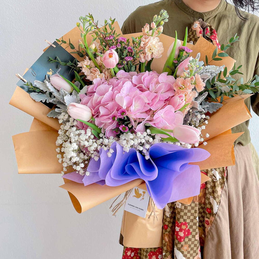 Contains : 7 Pink Tulips, 1 Pink Hydrangea, 3 Mathiola, Purple Pom, Dusty miller, Eucalyptus, Foliage *Do note that our selection of flowers may exhibit peculiarities in shade and tone from picture references on this page. That is the beauty of nature! However, rest assured that colour themes and style will be in accordance with your choice.