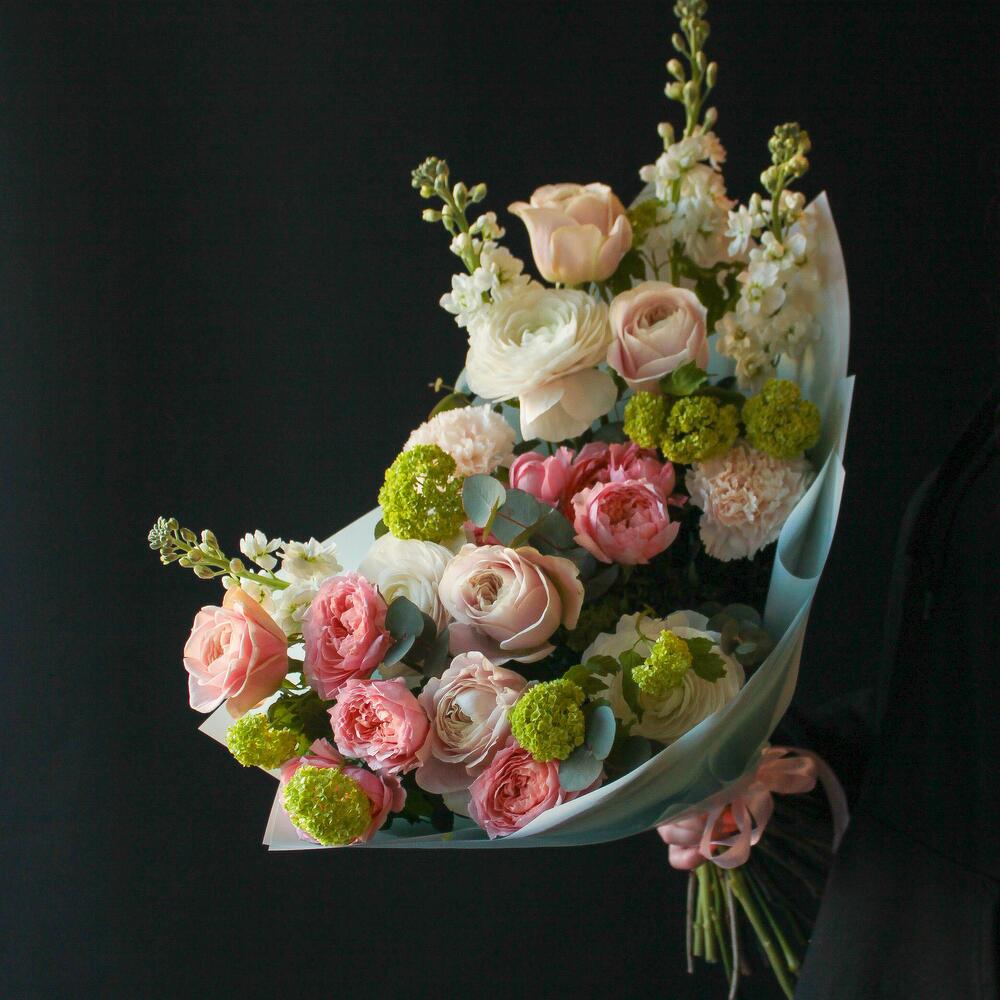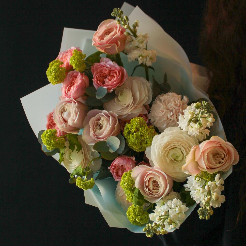 Eucalyptus - 4 pcs Viburnum - 3 pcs Pistachio - 3 pcs rose - 5 pcs carnation - 3 pcs ranunculus - 3 pcs matthiola - 4 pcs bush rose - 3 pcs korean foil - 3 pcs