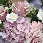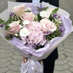 Satin ribbon - 1 pcs hydrangea - 1 pcs Clematis - 3 pcs packaging - 1 pcs roses ecuador - 5 pcs spray dianthus - 3 pcs