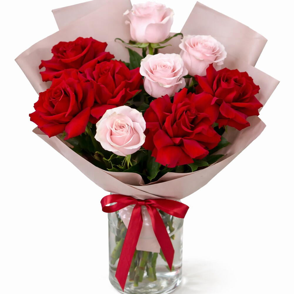A striking composition of deep red and soft blush roses, carefully arranged to create a perfect balance between passion and tenderness. Wrapped in elegant nude-toned paper and finished with a bold red ribbon, this bouquet is designed to captivate instantly. A timeless expression of love, desire, and refined emotion — ideal for romantic gestures, anniversaries, or moments that demand impact.