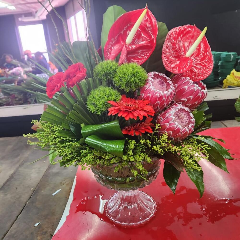 king protea - 3 pcs red anthurium - 2 pcs iris mosses - 3 pcs