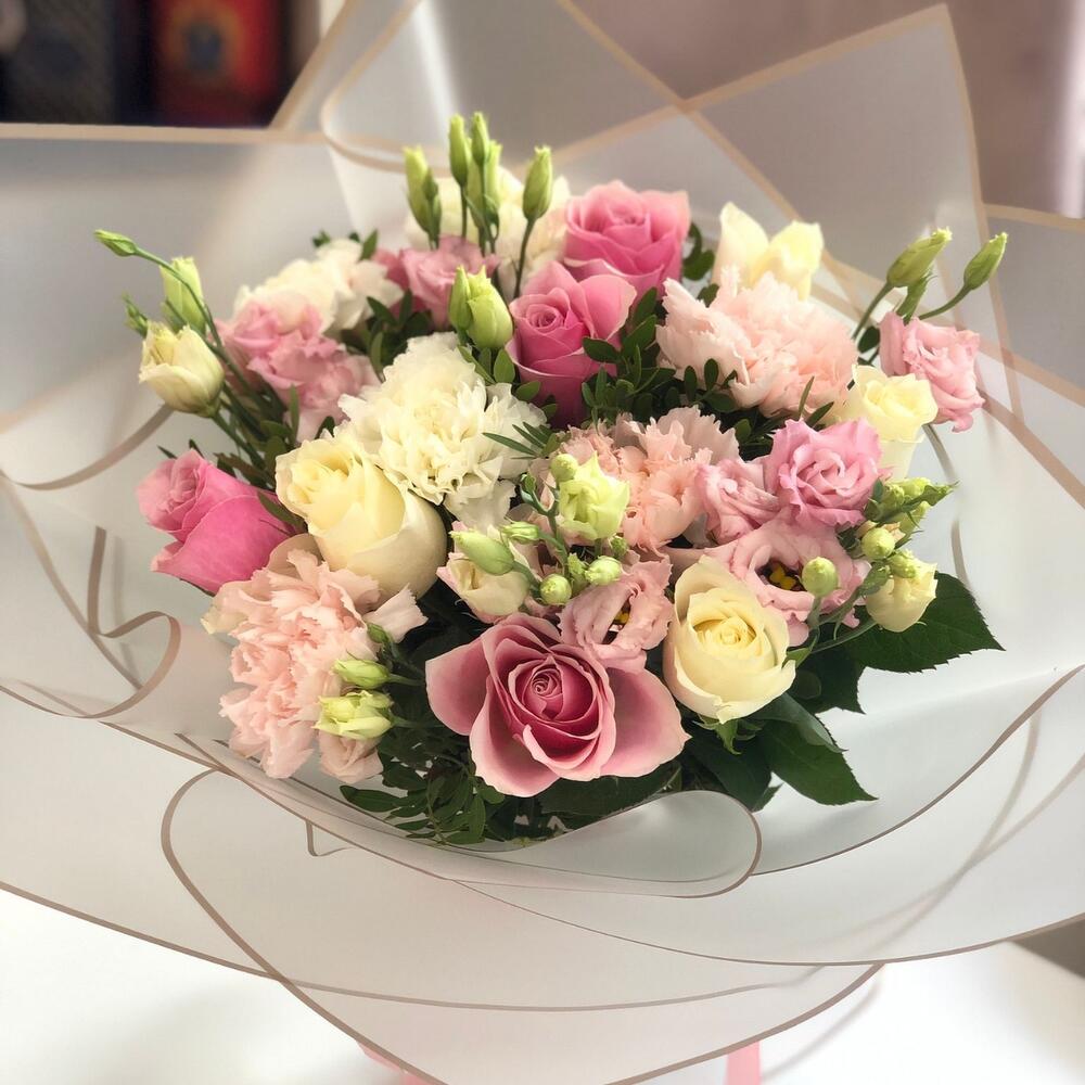 Satin ribbon - 2 pcs Eustoma - 3 pcs designer packaging - 2 pcs decorative greenery - 7 pcs pink rose 50 cm (kenya) - 5 pcs crafiat - 5 pcs