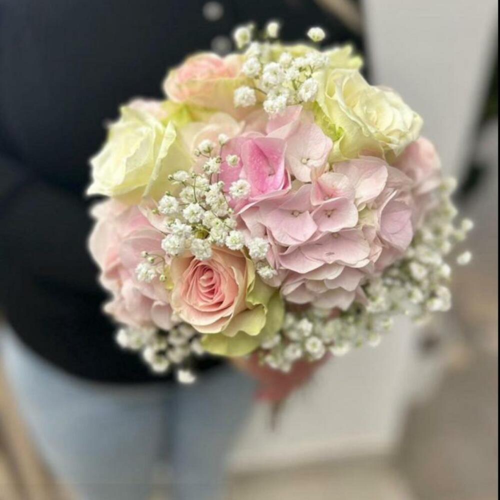 Hydrangea - 1 pcs rose - 7 pcs gypsophile - 4 pcs satin ribborn - 1 pcs