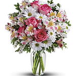 Would you like to make someones day - or week, even? Surprise them with this fresh, fabulous array of pink roses, pink alstroemeria, white mums and white statice in a sparkling glass vase. Theyll love it. And love you even more. This charming bouquet incudes pink roses, pink alstroemeria, white daisy spray chrysanthemums and white statice accented with assorted greenery. Delivered in a clear glass vase. Orientation: All-Around SUBSTITUTION POLICY – Always deliver the freshest flowers! Please note the bouquet pictured reflects our original design. If the exact flowers or container in this arrangement are not available, our local florists will create a beautiful bouquet with the freshest available flowers.
