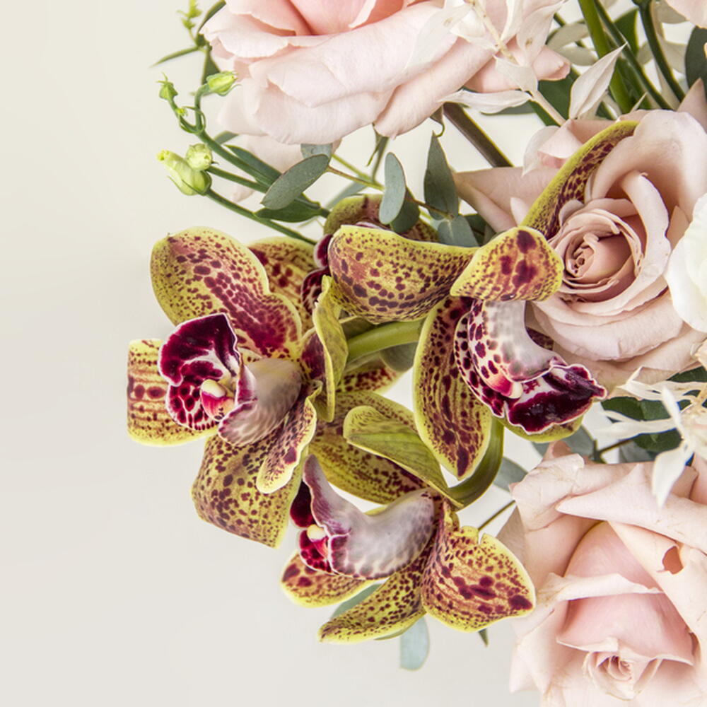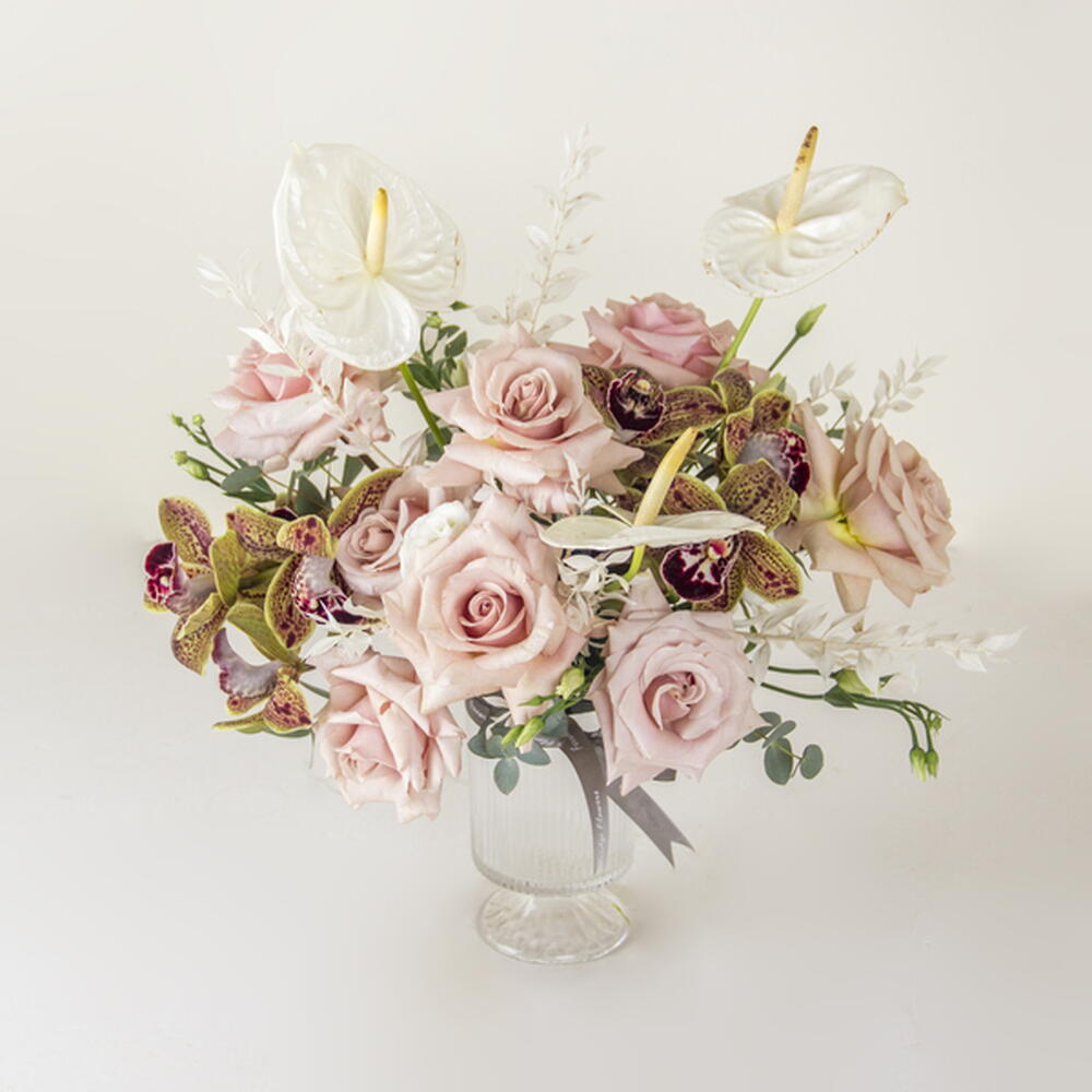 The combination of the classic rose with the more exotic orchids and anthuriums creates a bouquet that is both timeless and intriguing.