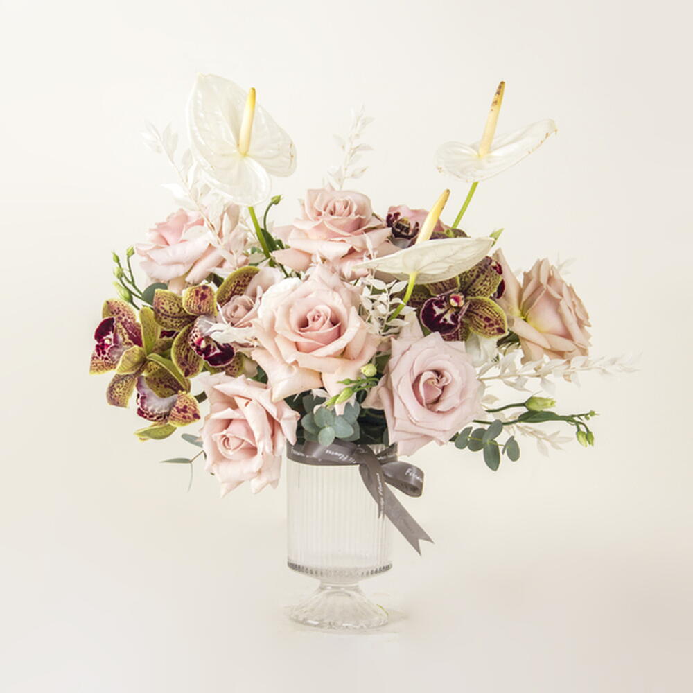 Anthurium - 3 pcs glass vase - 1 pcs cymbidium orchids - 6 pcs roses - 10 pcs