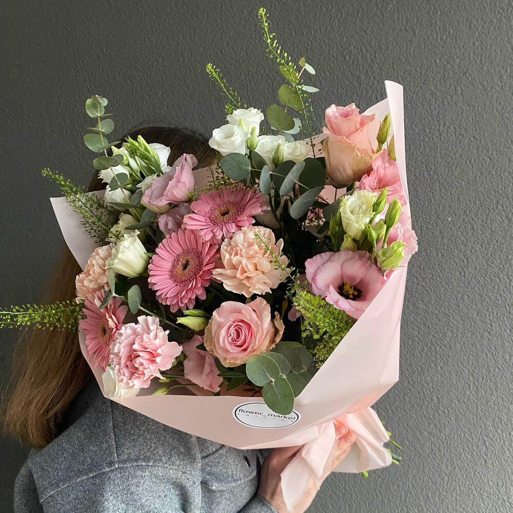 Eustoma - 4 pcs Gerbera - 3 pcs Green bell - 2 pcs dianthus - 3 pcs eucalyptus - 3 pcs roos - 2 pcs