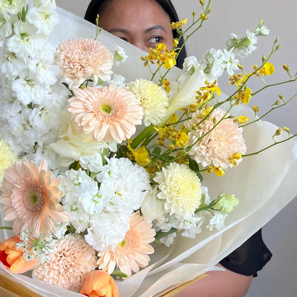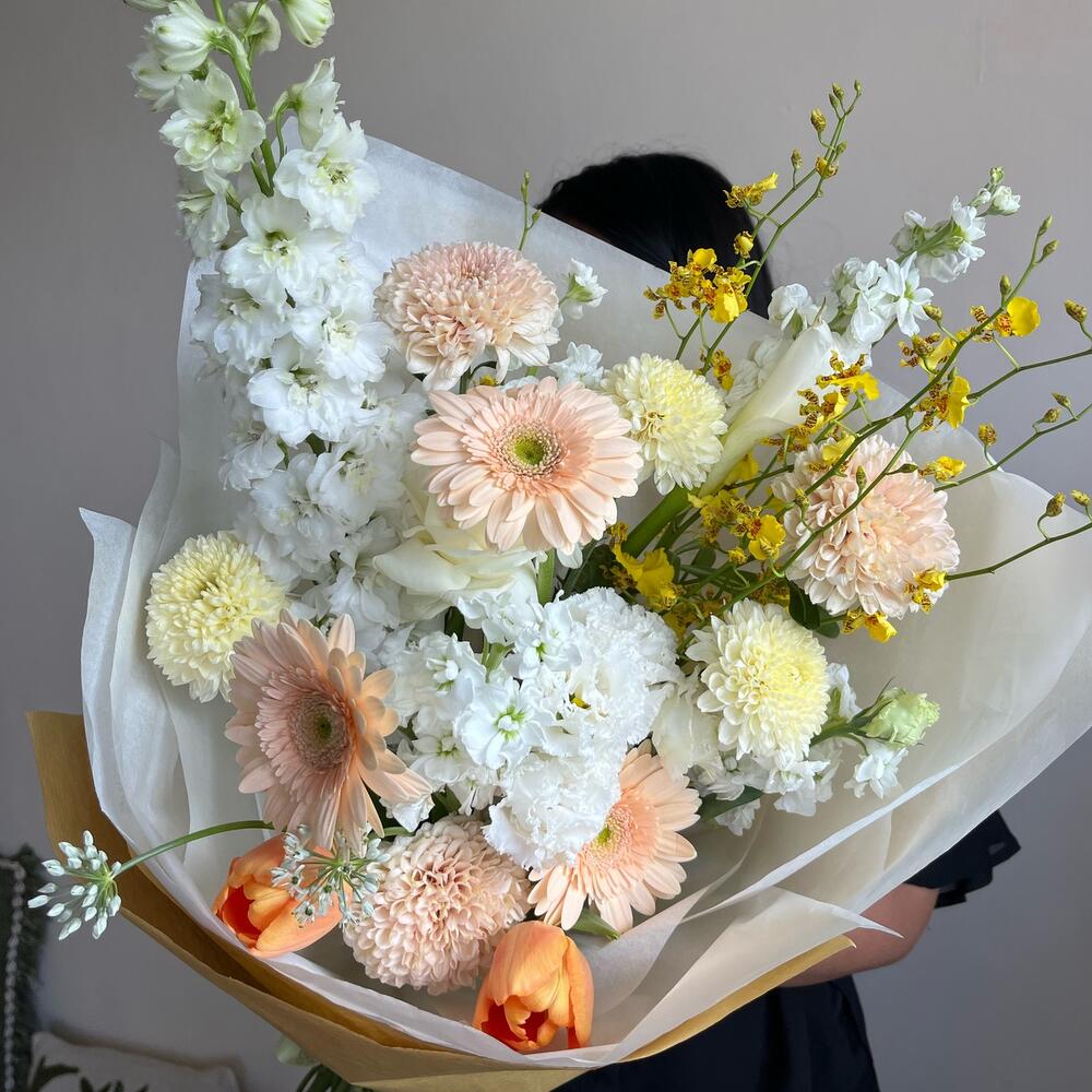 Dear customers, our arrangements are made from seasonal flowers, so substitutions may occur depending on availability. Due to the geographical features of Bali, where we are located, slight changes of flowers may also happen without affecting the overall look of the bouquet. Our priority is to preserve the style, color scheme, and mood of the composition. We sincerely appreciate your understanding.