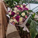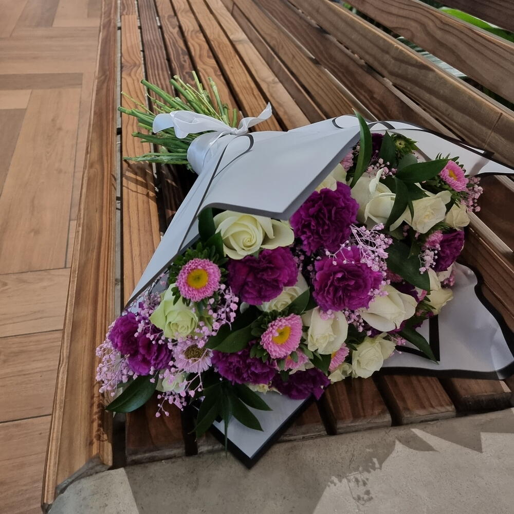 Ruscus - 5 pcs purple carnations - 8 pcs ribbon white - 1 pcs wrapping paper white - 2 pcs white roses - 13 pcs purple gypsophila stems - 5 pcs seed asters pink - 8 pcs
