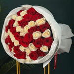 Unveil the language of love and affection with this stunning mono bouquet. Hand-picked and artistically arranged, it features 25 radiant red roses of fervent passion, harmoniously intertwined with 25 pristine, white roses of pure innocence and devotion. This bouquet is more than a gift; its an unforgettable gesture of your hearts sincerest emotions.