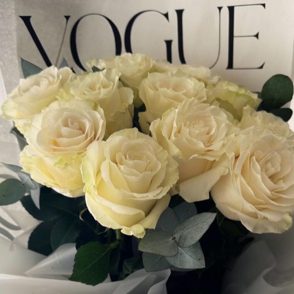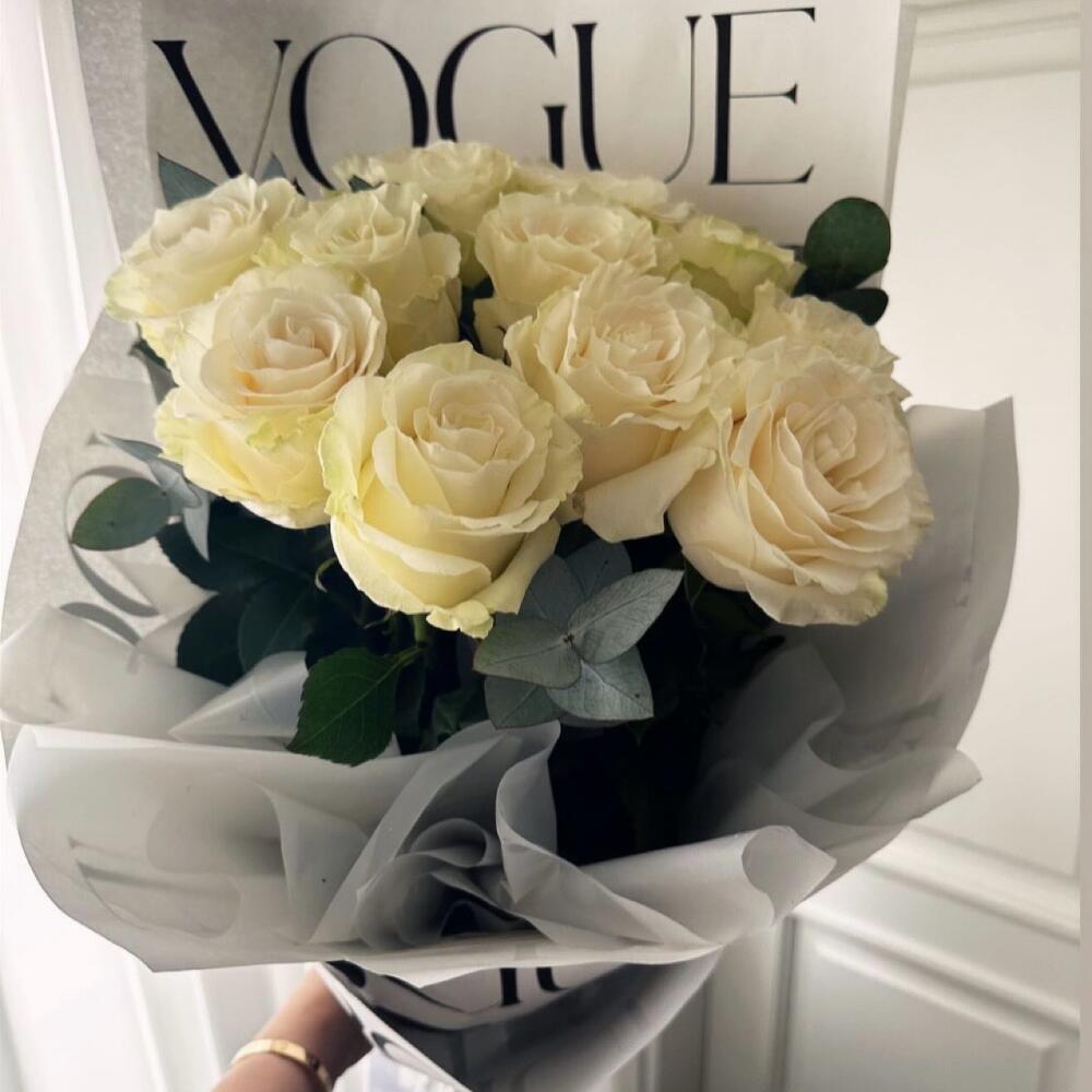 Ribbon - 1 pcs Eucalyptus - 3 pcs paper - 4 pcs roses - 11 pcs