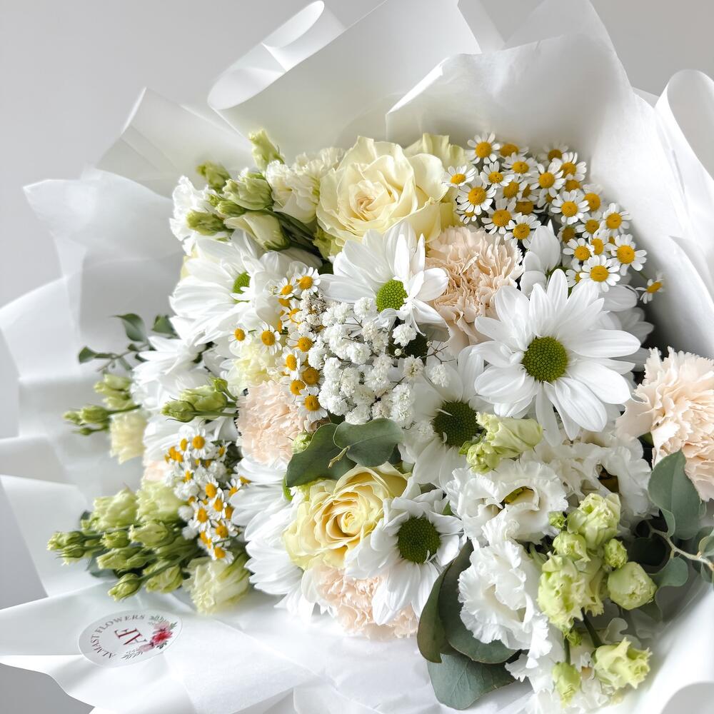 Eustoma - 4 pcs Eucalyptus - 7 pcs rose white - 3 pcs chamomile - 3 pcs dianthus - 3 pcs chryzantemum - 2 pcs