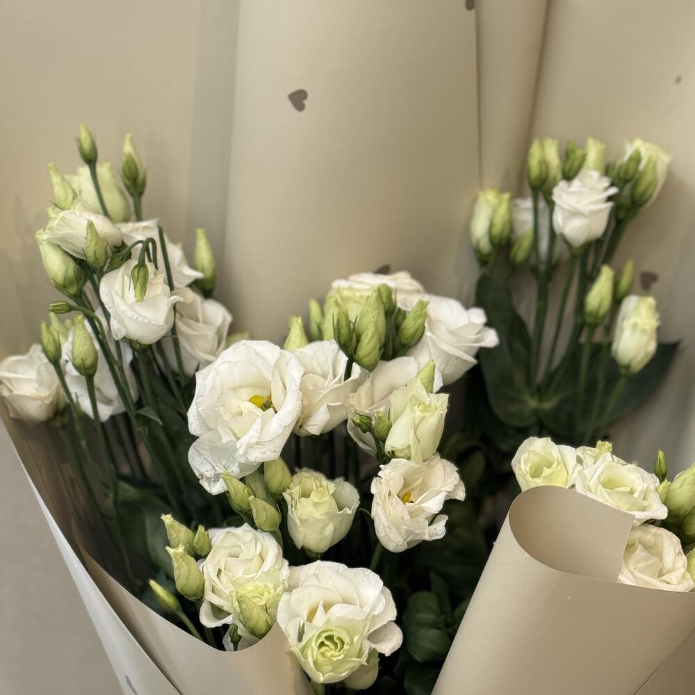 Ribbon - 1 pcs Eustoma white - 5 pcs paper - 3 pcs