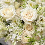 Eustoma - 8 pcs hydrangea - 2 pcs Lilac - 6 pcs spiraea - 4 pcs rose - 7 pcs ranunculus - 3 pcs diantus - 5 pcs