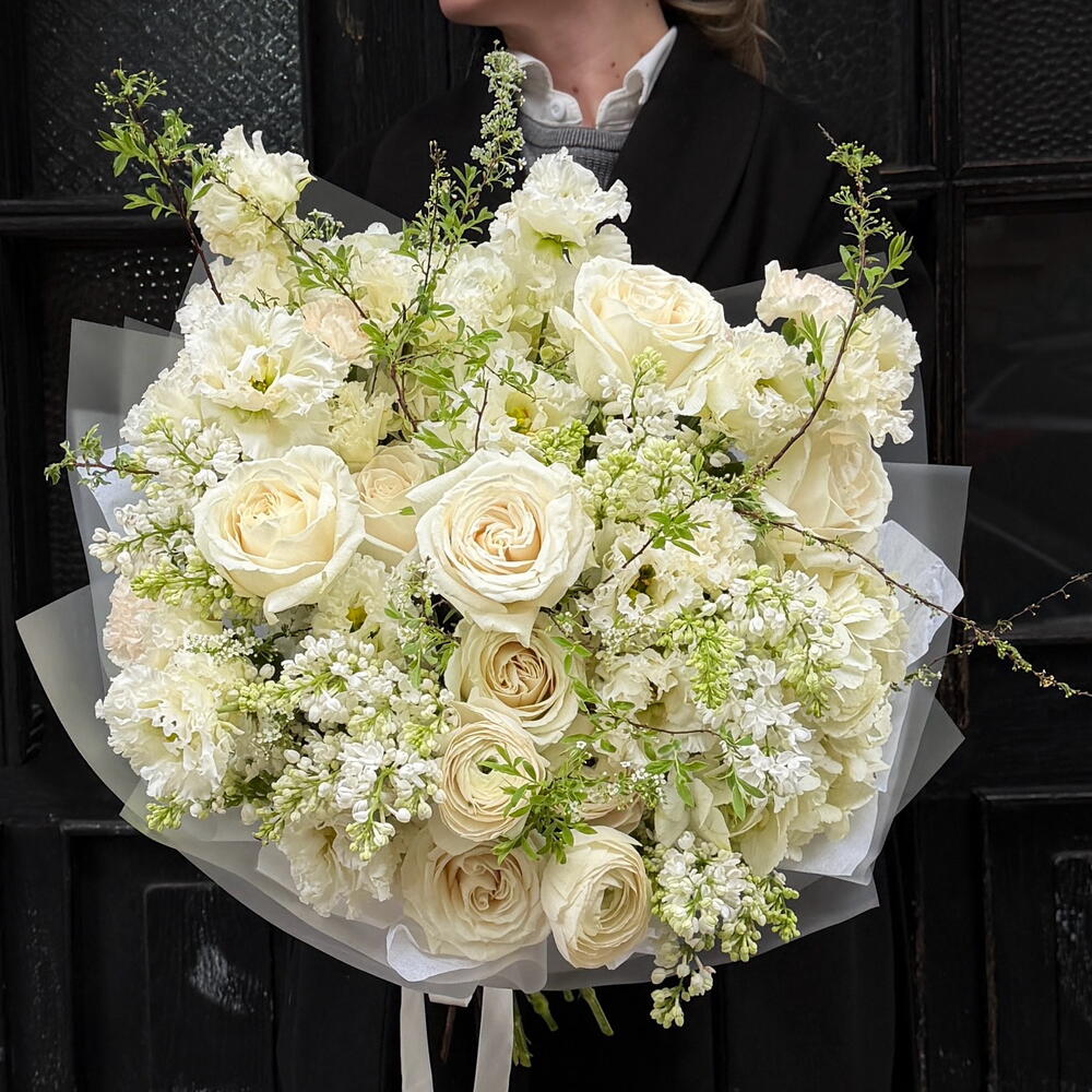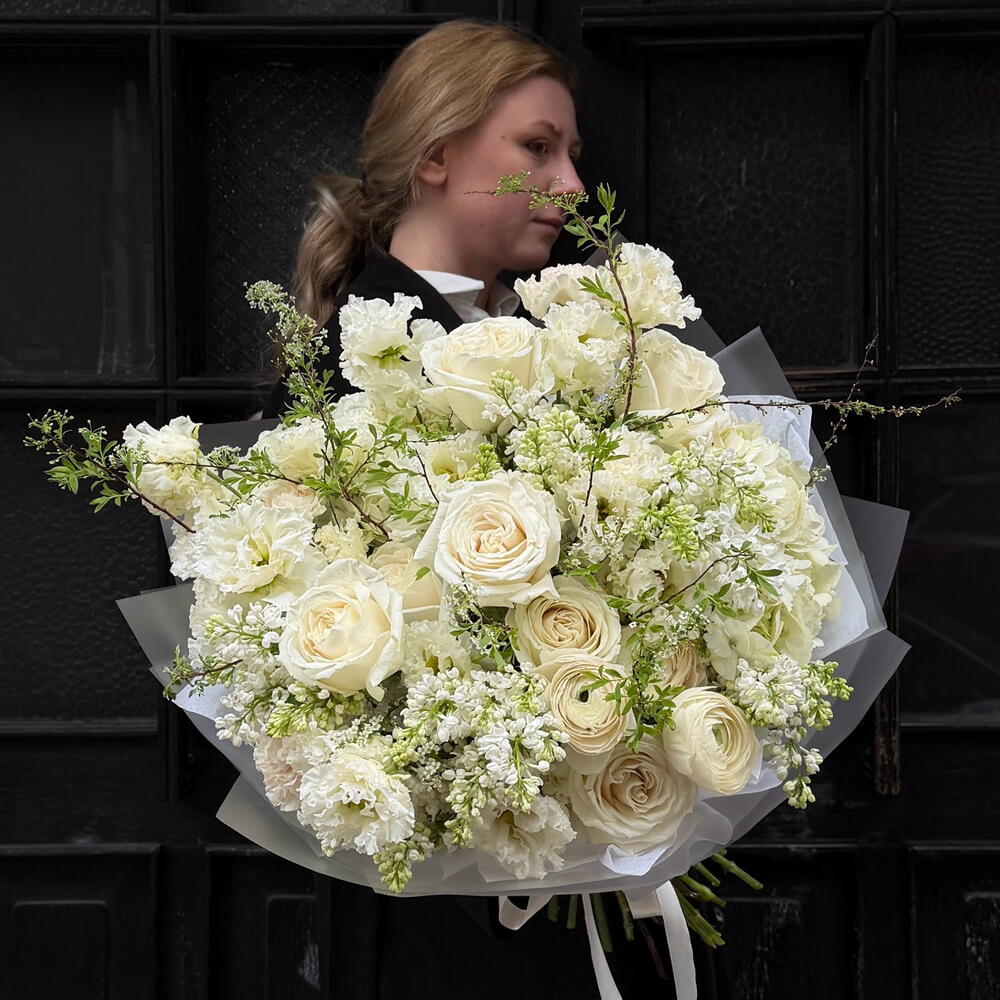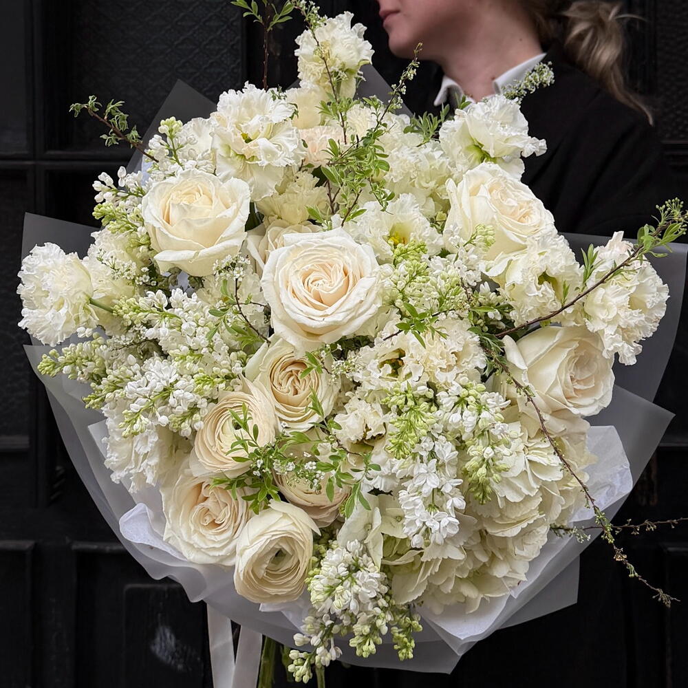 Eustoma - 8 pcs hydrangea - 2 pcs Lilac - 6 pcs spiraea - 4 pcs rose - 7 pcs ranunculus - 3 pcs diantus - 5 pcs