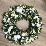 Ruscus - 20 pcs Chrysanthemum - 10 pcs Lisianthus - 10 pcs Pistachio - 20 pcs Oasis - 1 pcs santini - 10 pcs hypericum - 10 pcs Eucalyptus cinerea - 15 pcs white roses - 10 pcs