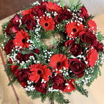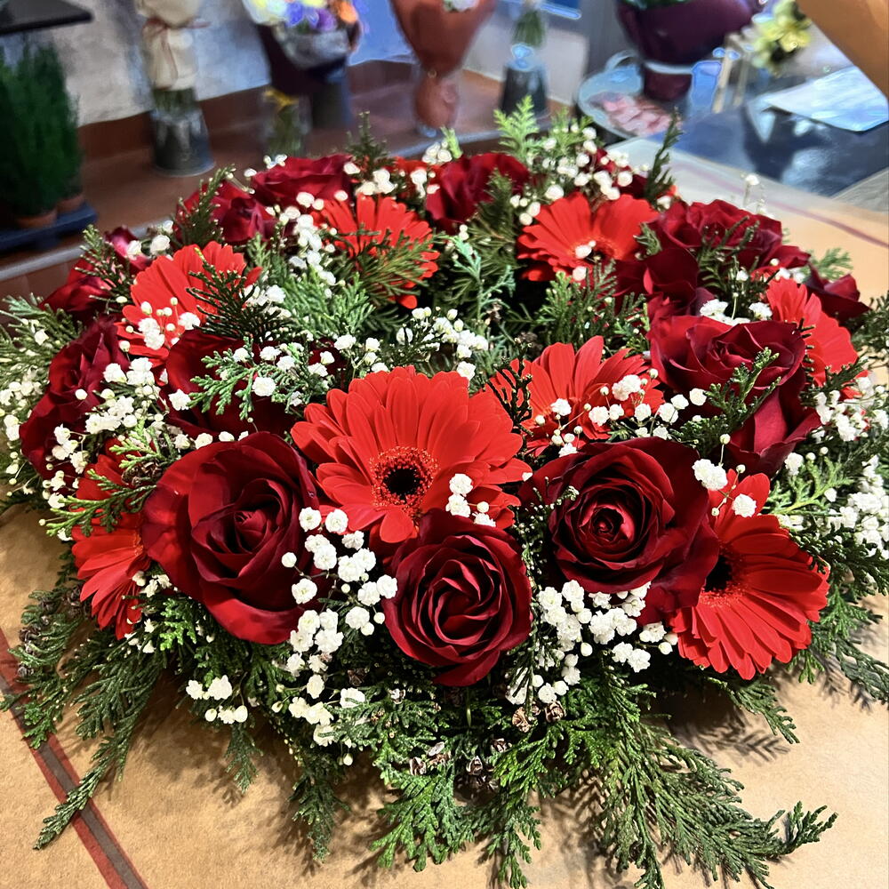 A small funeral wreath in a classic, circular form is a symbol of remembrance, continuity, and respect. A composition of red roses and gerberas expresses deep feelings and the lasting nature of memories. Delicate baby's breath gives the whole arrangement lightness and subtly balances the intense colors of the flowers. The harmonious form of the wreath emphasizes its symbolic character and elegance. It is a small but expressive arrangement suitable as a final gesture of remembrance.