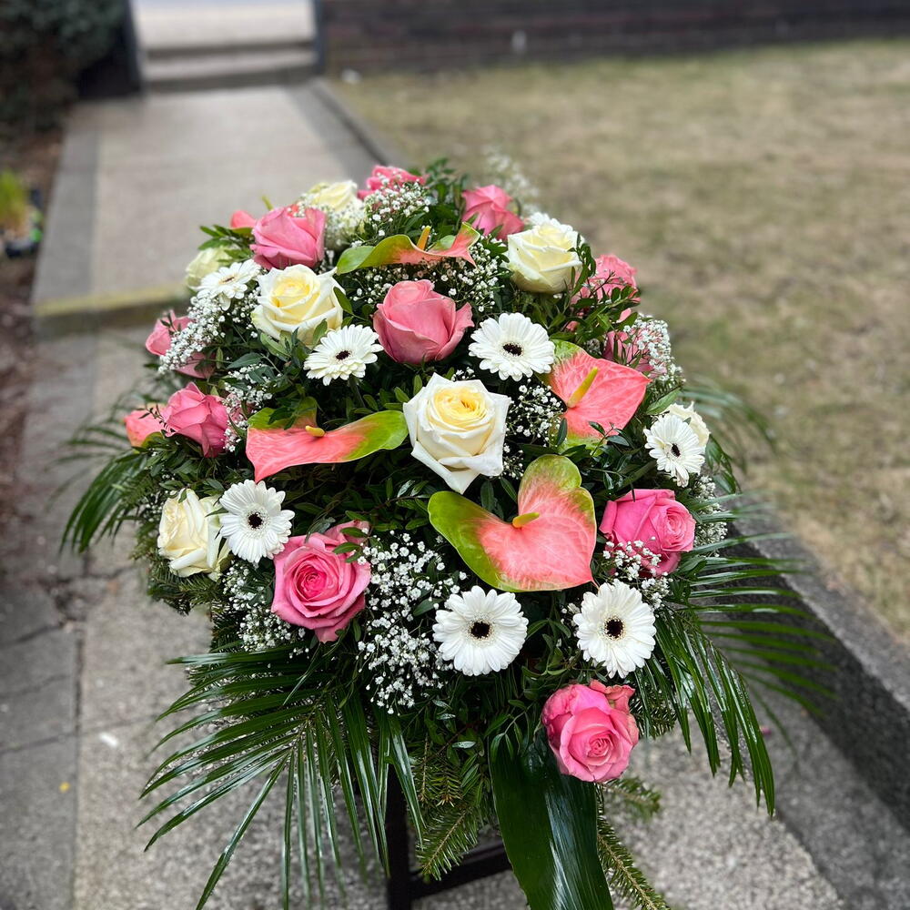 An elegant funeral bouquet in a subdued, light color palette is an expression of respect, remembrance, and farewell. The combination of pink and white roses with delicate white gerberas and anthuriums creates a harmonious, peaceful composition. Light gypsophila and decorative greenery give the whole a subtle and natural character, emphasizing its dignified and balanced appearance. The bouquet is suitable as a final gesture of remembrance and an expression of sympathy in difficult times.