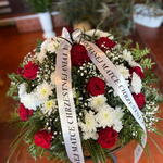 A medium-sized funeral bouquet in a classic, round form is an elegant expression of remembrance and respect. Red roses symbolize love and deep feelings, while white chrysanthemums emphasize sincerity, peace, and remembrance. Delicate baby's breath gives the composition lightness, and the harmonious arrangement of the flowers creates a calm, balanced whole with a traditional character. It is an appropriate way to bid farewell to a loved one with dignity and to express your sympathy.