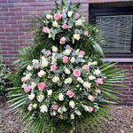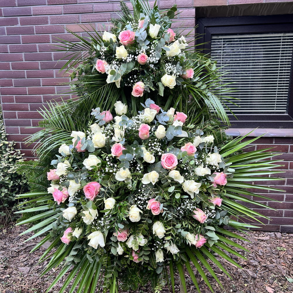 An elegant standing funeral wreath in a light, harmonious color palette is an expression of respect, remembrance and a dignified farewell. The combination of white and pink roses symbolizes purity, gratitude and warm memories. Delicate baby's breath lends the composition lightness, while the greenery emphasizes its natural, peaceful character. Altogether, it creates a classic, elegant wreath suitable for the final farewell of a loved one.