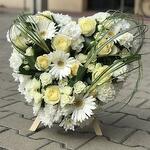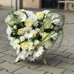 Medium-sized funeral wreath in the shape of a heart, 30-40 cm wide, made in light colors using roses, gerberas, and carnations with added greenery. The wreath comes complete with a stand. A funeral ribbon with a message specified by the client can be included with the bouquet free of charge. The product can be delivered to the church at a specific time or to the cemetery.