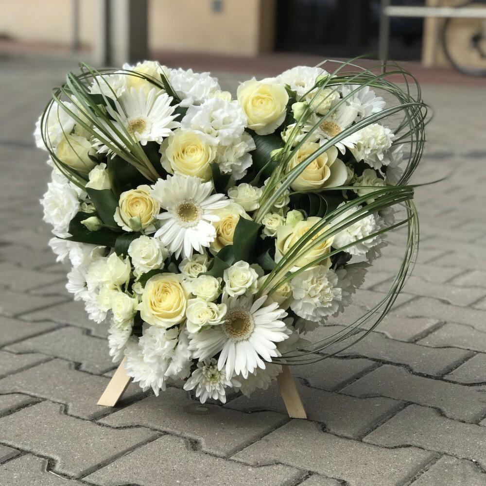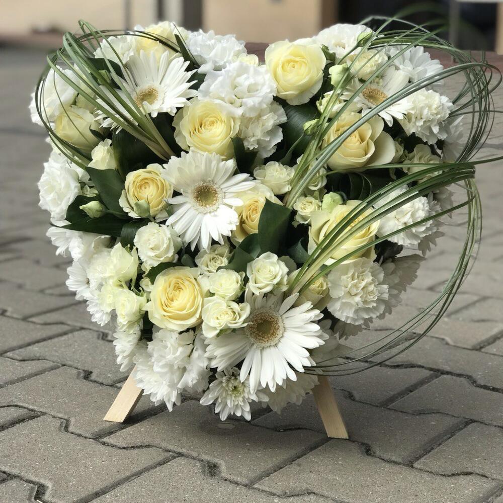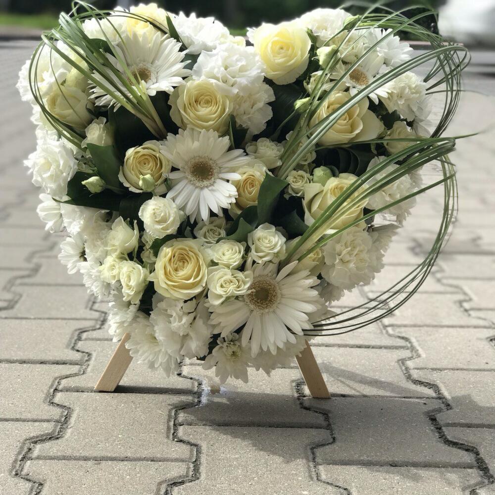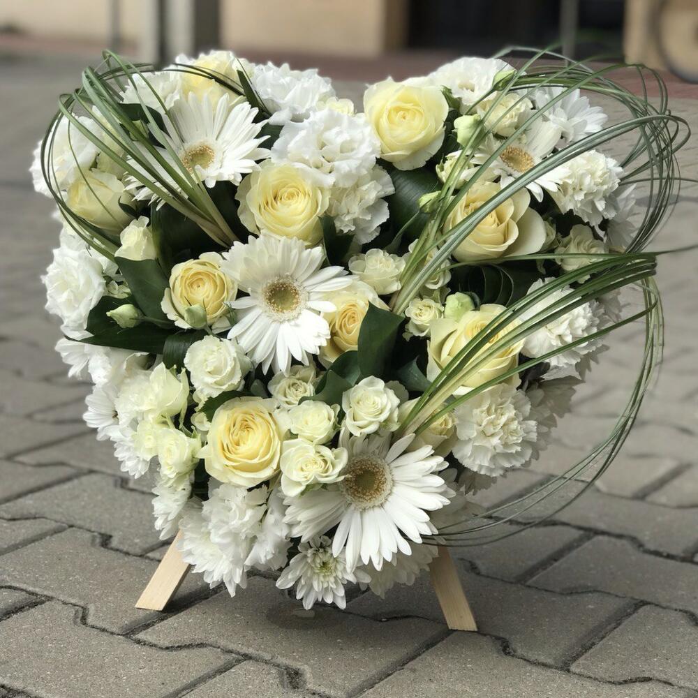 Medium-sized funeral wreath in the shape of a heart, 30-40 cm wide, made in light colors using roses, gerberas, and carnations with added greenery. The wreath comes complete with a stand. A funeral ribbon with a message specified by the client can be included with the bouquet free of charge. The product can be delivered to the church at a specific time or to the cemetery.