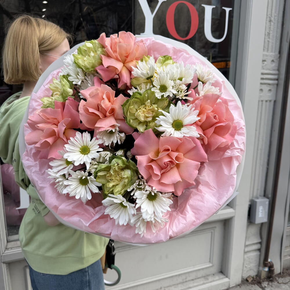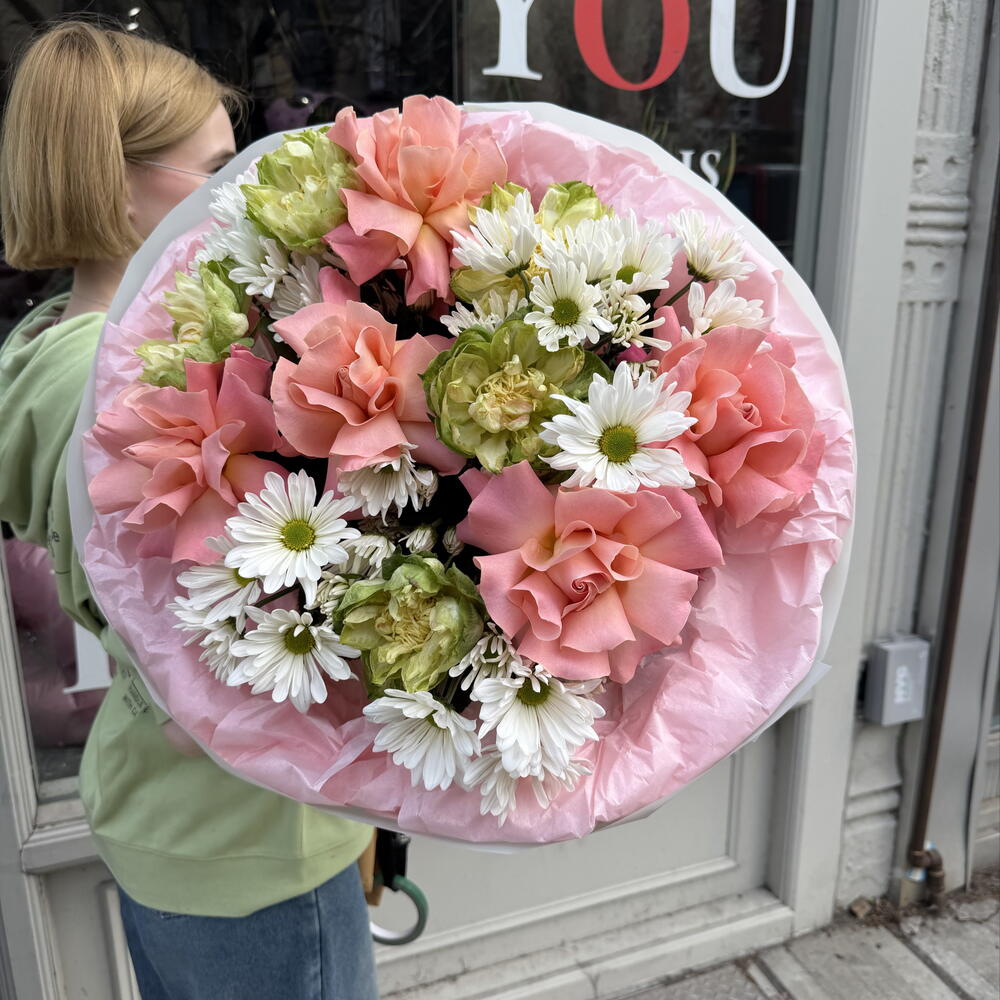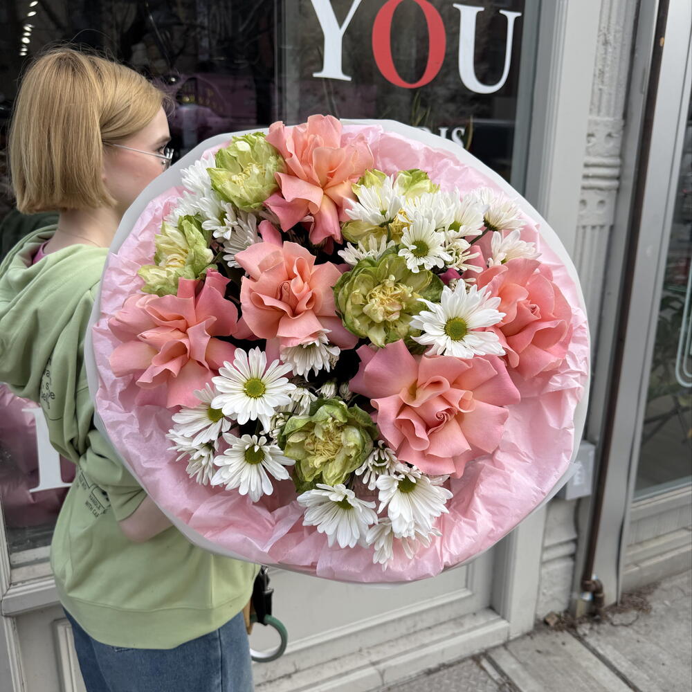 A playful and effortlessly charming mix, Wild Handful brings together the soft elegance of French Hermosa roses with the fresh, carefree spirit of daisies and unique veggie roses. The coral-toned blooms add warmth and romance, while crisp white daisies create a light, airy contrast, giving the bouquet a natural, just-picked-from-the-garden feel. Wrapped in delicate blush paper, this arrangement feels joyful, organic, and full of life—perfect for brightening someone’s day or celebrating simple, beautiful moments.