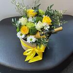 Satin ribbon - 1 pcs Box - 1 pcs Chrysanthemum - 2 pcs Greens - 3 pcs rose - 4 pcs carnation - 3 pcs wine - 1 pcs