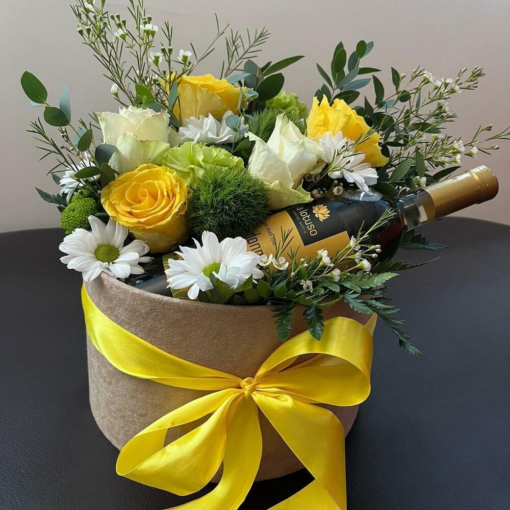 The wine can be of your choice: white, red or rose. Note: The design of the bouquet can be changed to a similar one if the required material is not available