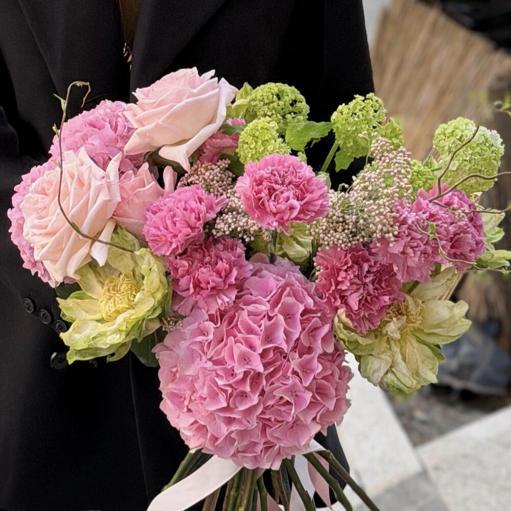 Viburnum - 2 pcs dianthus - 7 pcs hydrangea - 2 pcs rose o’hara - 3 pcs vegan rose - 5 pcs spring branches - 2 pcs satin ribbon or elegant gift packaging (on request) - 1 pcs
