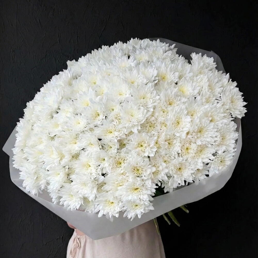 Incredible volume and longevity! This bouquet of 45 spray chrysanthemums looks magnificent—like a giant snowy cloud. Thanks to the lush blooms on each stem, this arrangement looks visually larger than 100 roses and is guaranteed to impress. Incredible volume and longevity! A bouquet of 45 chrysanthemum branches looks impressive—like a giant, snow-white cloud. Because chrysanthemums are a branching flower, the bouquet is visually larger than 101 roses and makes a huge impression.
