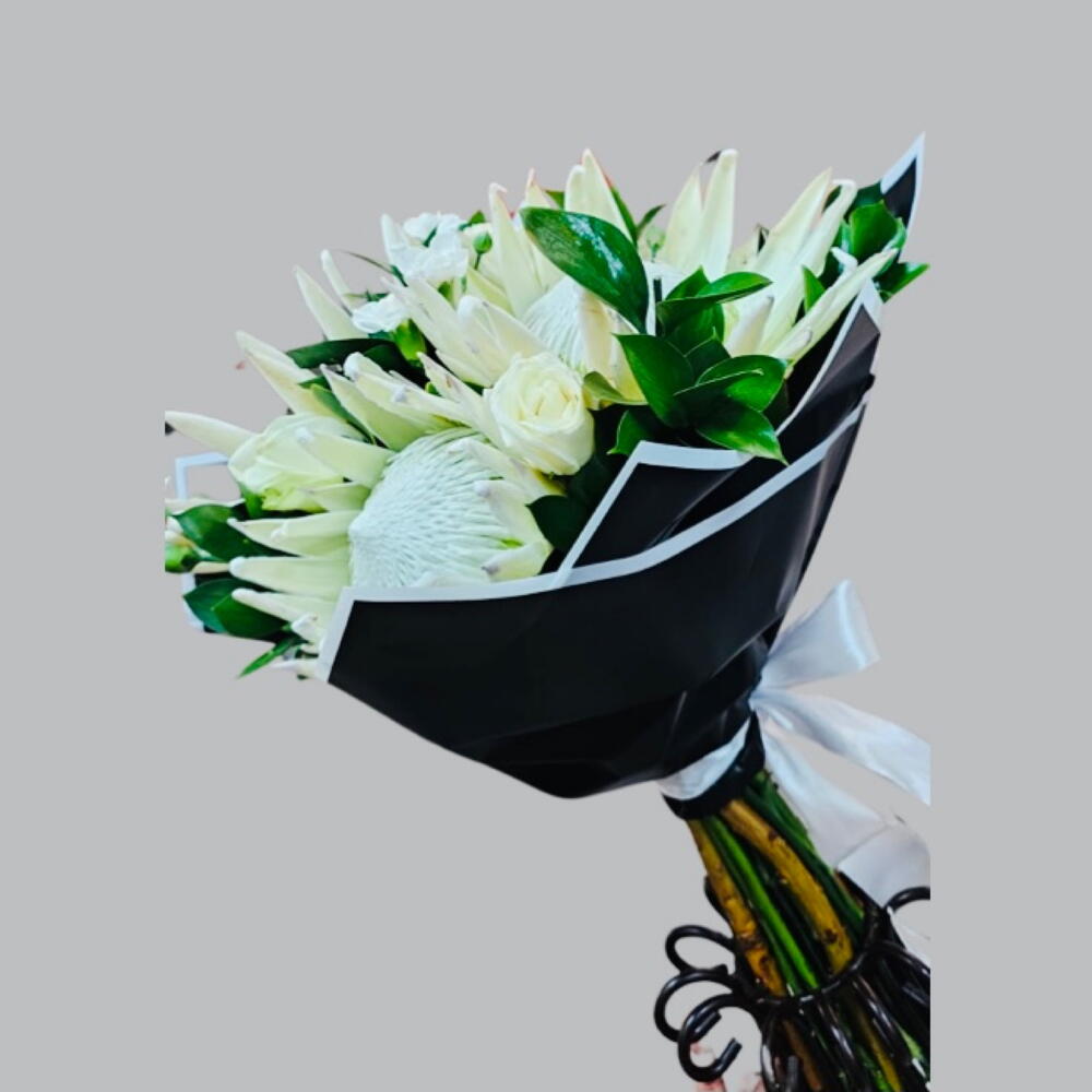 white roses - 5 pcs white king protea - 5 pcs stems ruskus - 20 pcs white mini carnations - 7 pcs