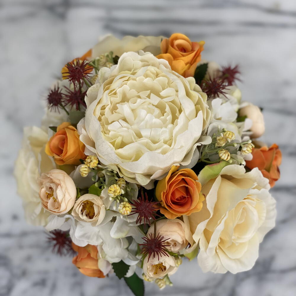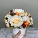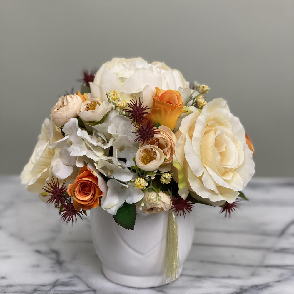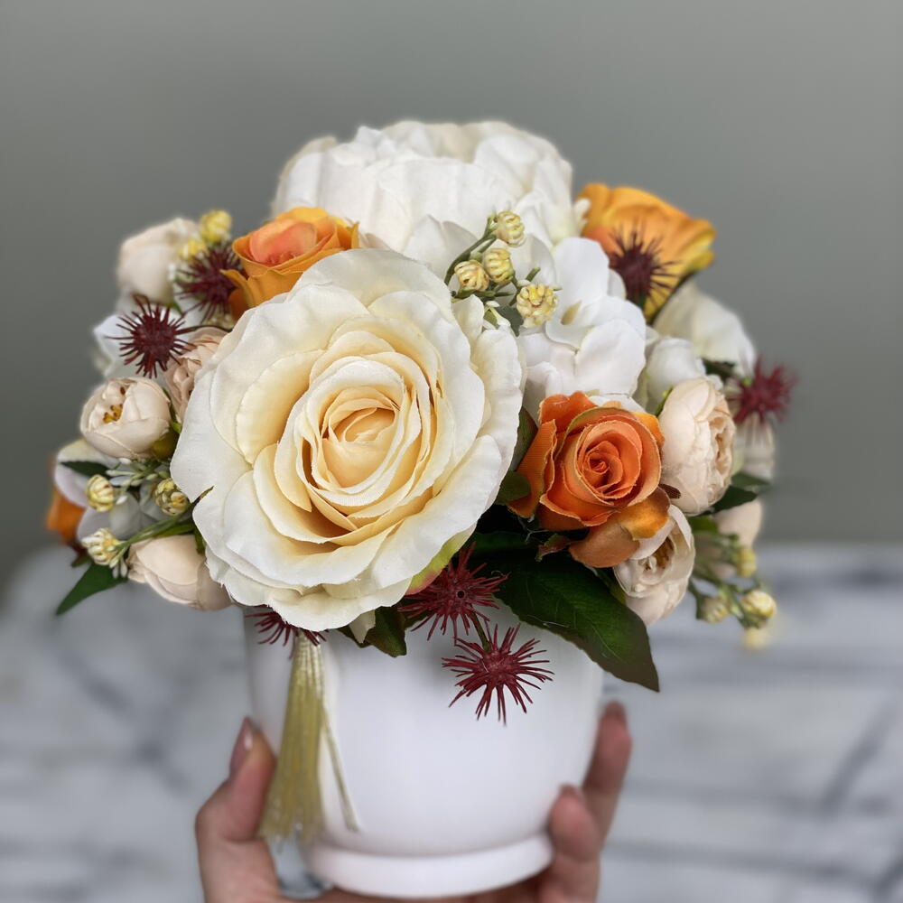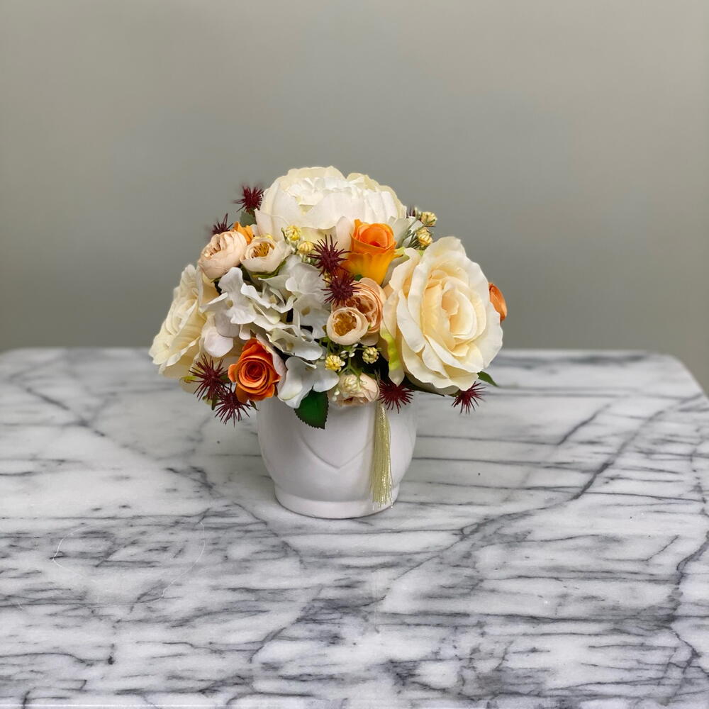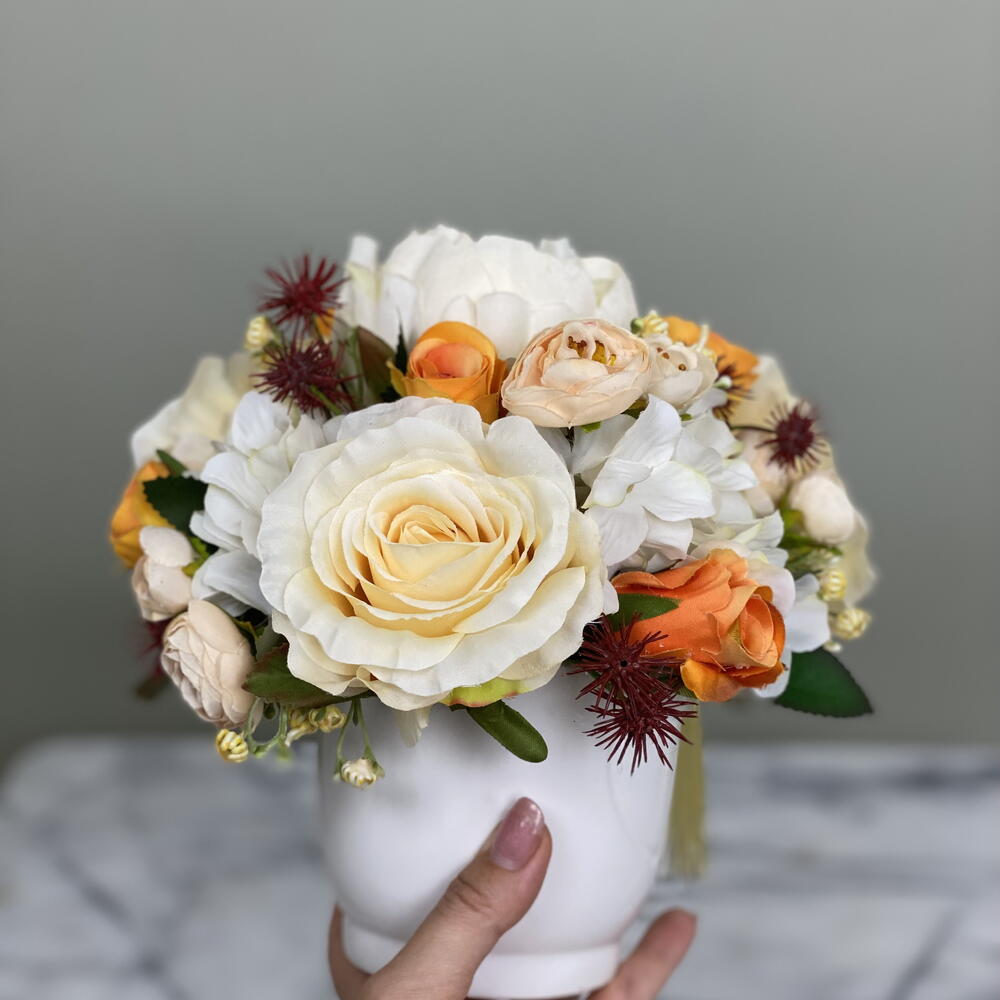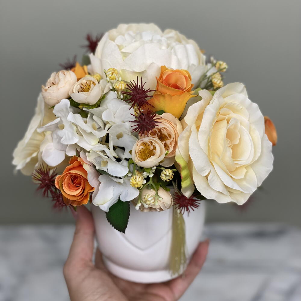 Dieses liebevoll gestaltete Arrangement vereint elegante Rosen, zarte Pfingstrosen, verspielte Mini-Blüten und dekorative Akzente zu einem harmonischen Gesamtbild. Die warmen Creme- und Orangetöne bringen Gemütlichkeit und Frische in jeden Raum. Ob als Geschenk oder stilvolles Dekoelement – dieses Arrangement bleibt dauerhaft schön und benötigt keinerlei Pflege. Die hochwertigen, realistisch wirkenden Kunstblumen sind in einem stilvollen weißen Keramikgefäß arrangiert und machen jedes Interieur ein Stück heller und freundlicher.