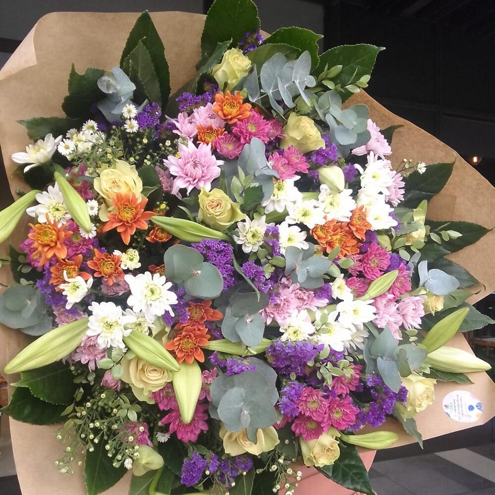 Eucalyptus - 10 pcs white lillies - 10 pcs purple statice - 10 pcs pink chrysanthemums - 10 pcs cream roses - 10 pcs chrysenthemums white - 4 pcs purple pink orange and white bouquet - 100 g orange chrysenthemums - 5 pcs