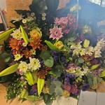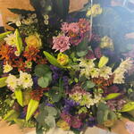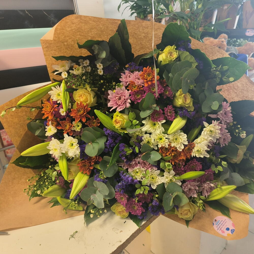 An XX large bouquet made of pink, purple, cream chrysenthemums, cream roses and lillies together wit