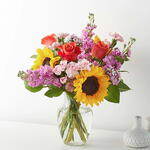 Transport her to the Land of Oz with this enchanting mix of sunflowers, Sweet William dianthus, and mini carnations. Details The Deluxe Bouquet is approximately 18H x 16W. Designed by florists, ready to display. For long–lasting blooms, replace the water daily. We suggest trimming the stems every couple days. Pet Safety Precautions: This bouquet or plant may include flowers and foliage that are known to be toxic to pets. To keep them safe, be sure to keep this arrangement out of your pets reach.