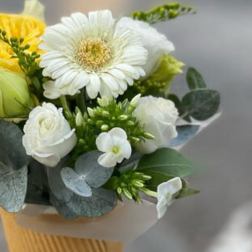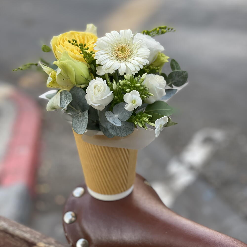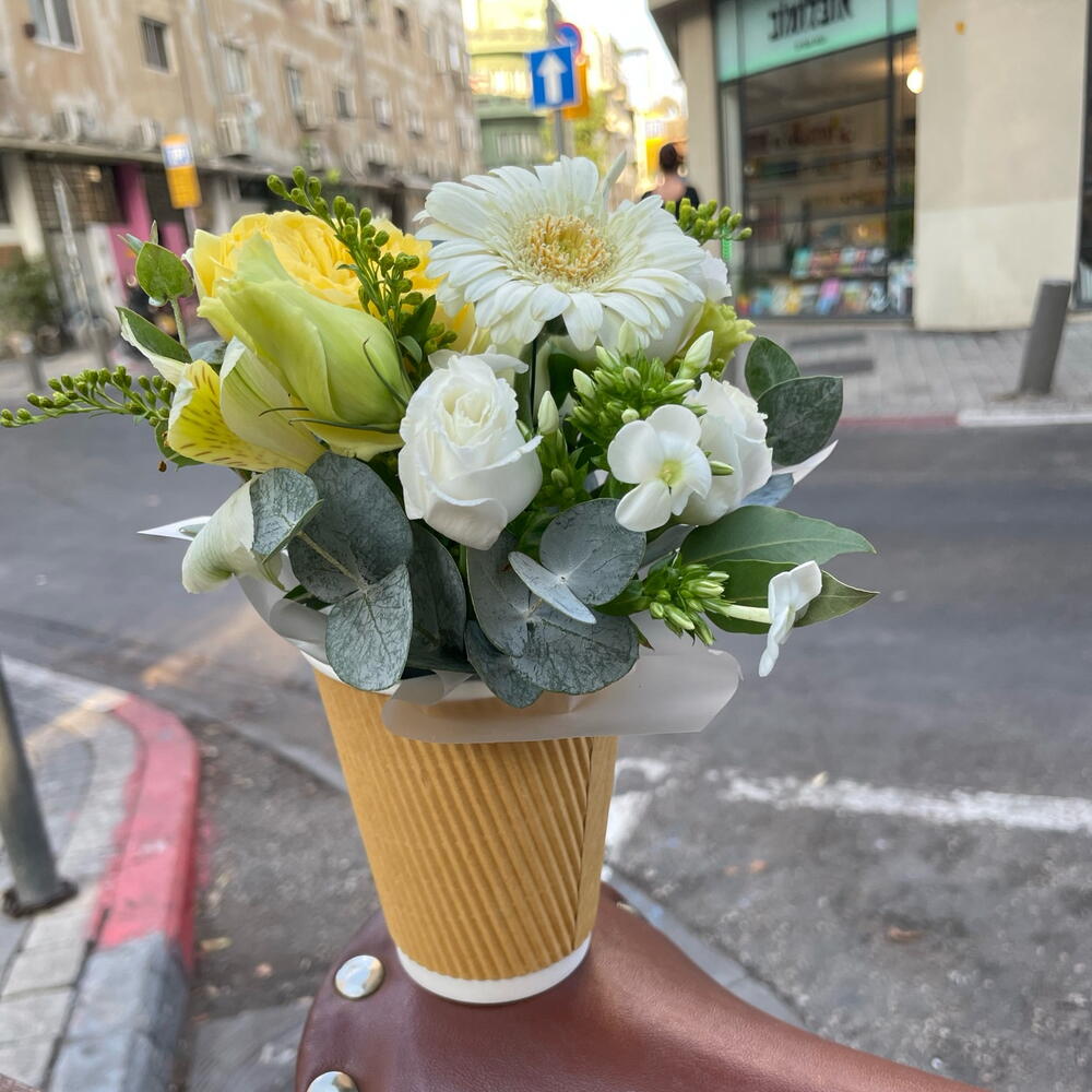 Мини-букет в стаканчике — идеальное сочетание простоты и очарования! Нежные розы, гербера и белоснежные бутоны в обрамлении эвкалипта создают лёгкое утреннее настроение, словно чашка кофе с солнечным привкусом. Цветы не имеют сильного аромата и подойдут даже для рабочего стола или прикроватной тумбы. Композиция устойчива и не требует особого ухода — просто добавляйте немного воды каждые пару дней, и она будет радовать вас свежестью до недели.