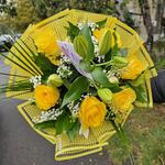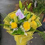 Satin ribbon - 1 pcs Yellow rose - 6 pcs hedera leaves - 4 pcs oriental lilly - 1 pcs paper wraping - 1 pcs gypsophila branch - 1 pcs palm robelini - 2 pcs