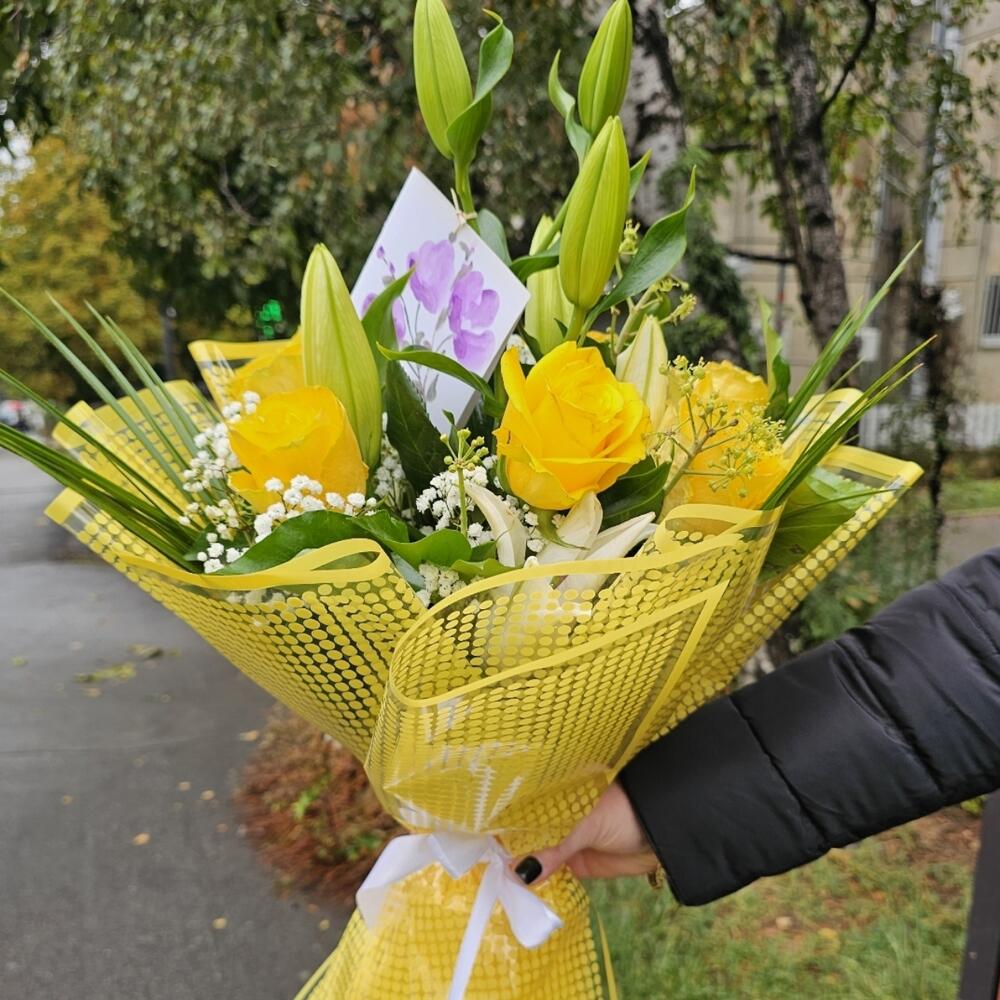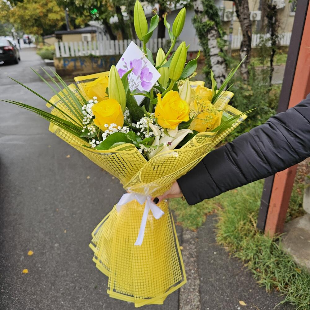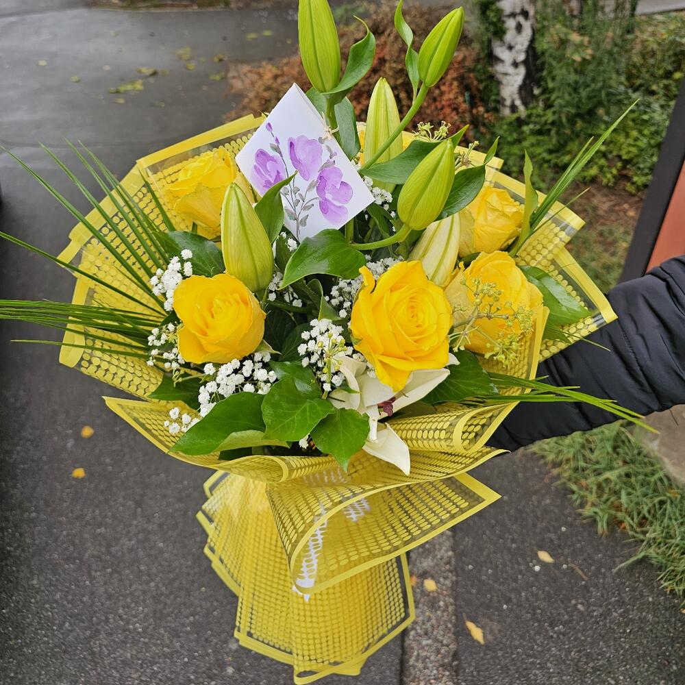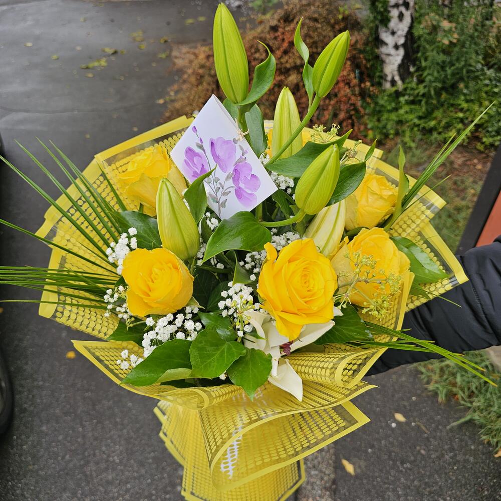 Satin ribbon - 1 pcs Yellow rose - 6 pcs hedera leaves - 4 pcs oriental lilly - 1 pcs paper wraping - 1 pcs gypsophila branch - 1 pcs palm robelini - 2 pcs