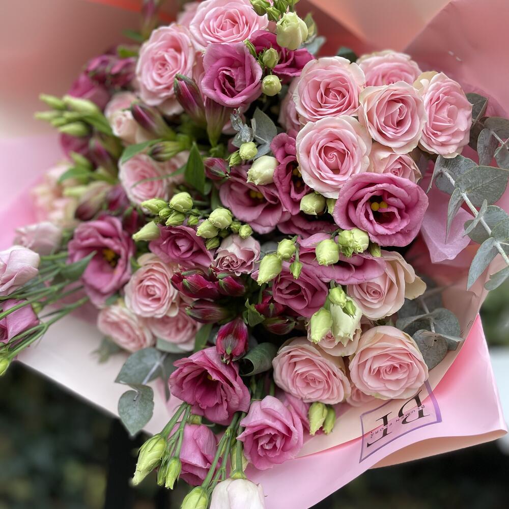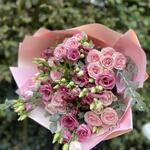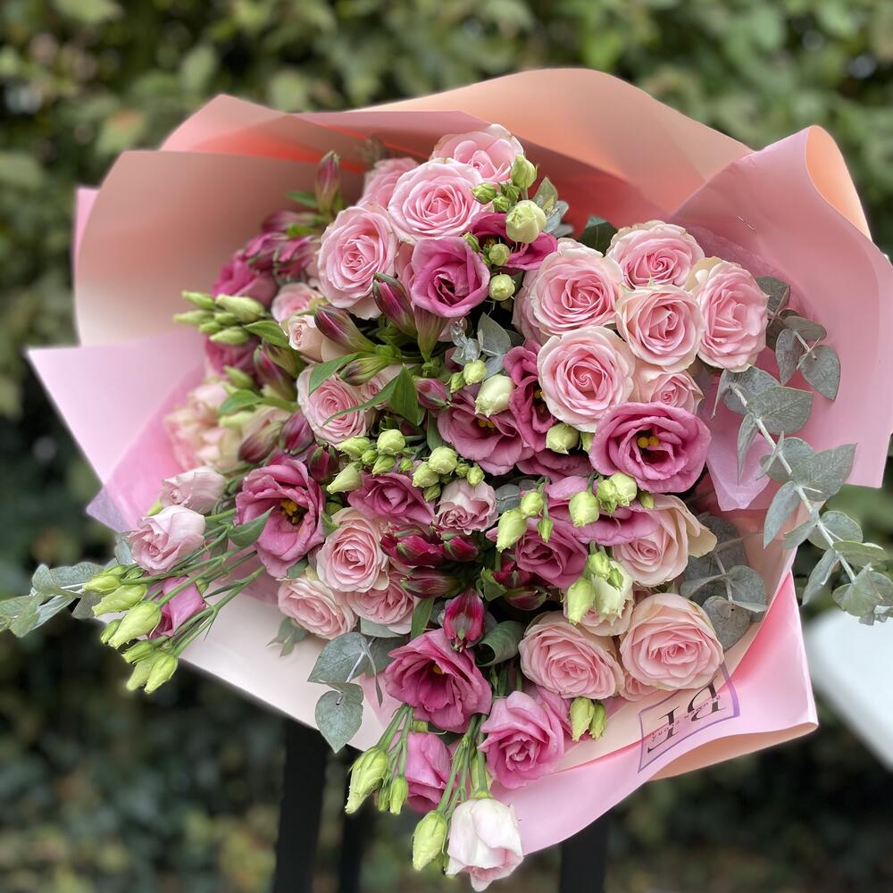 lisianthus pink - 5 pcs eucalyptus - 3 pcs roses spray - 7 pcs roses pink - 5 pcs