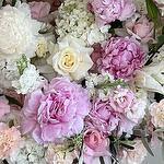 Matiola - 10 pcs Lily - 3 pcs Olive leaves - 7 pcs Peony - 10 pcs lisiantus - 15 pcs hydrangea - 5 pcs roses - 30 pcs garden roses - 7 pcs diantus white - 10 pcs