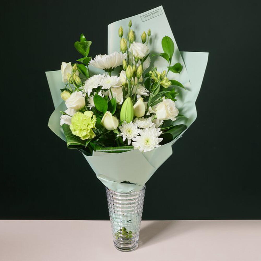 ליזיאנטוס - 4 pcs שושן צחור - 2 pcs חרצית - 3 pcs דיאנטוס - 2 pcs ורד לבן - 2 pcs