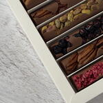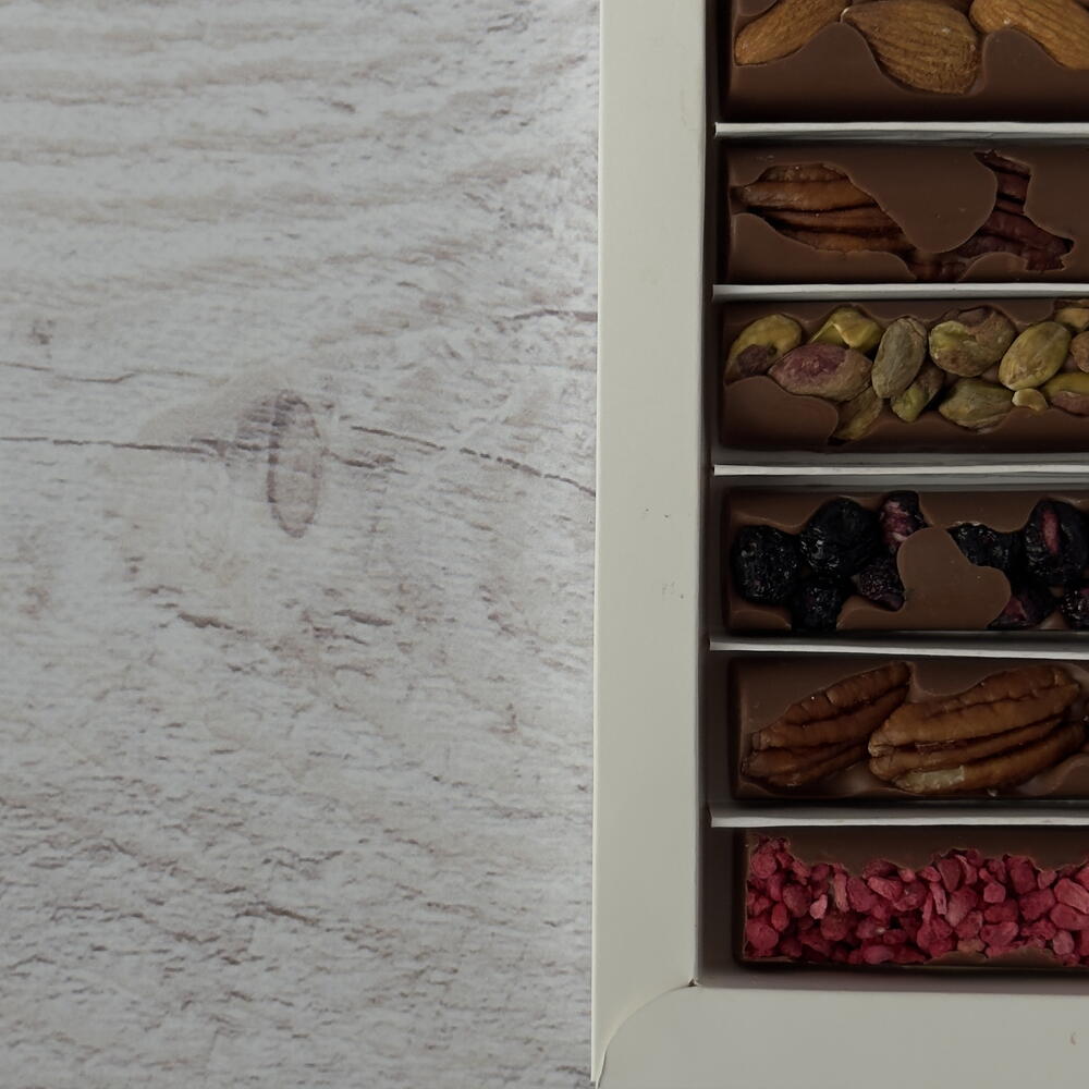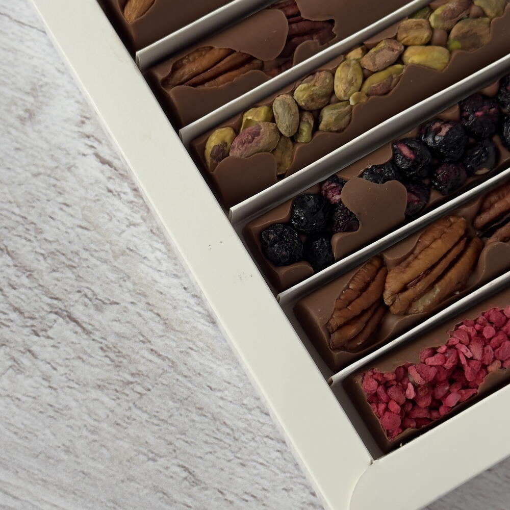 chocolat belge, framboise lyophilisée, myrtille lyophilisée, noix de pécan, pistaches, amandes