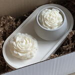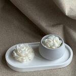 Un élégant ensemble de deux bougies blanches artisanales en cire de soja, ornées d'un motif floral. L'ensemble comprend une bougie dans un bougeoir en plâtre, décoré d'une fleur blanche en relief, et une bougie moulée en forme de fleur. Un socle décoratif en plâtre complète l'ensemble et en sublime l'esthétique. Chaque pièce est fabriquée artisanalement à partir de cire de soja naturelle et de plâtre, avec un souci du détail exceptionnel. La blancheur immaculée confère à cet ensemble une élégance intemporelle et s'harmonise parfaitement avec tous les intérieurs. Le délicat parfum de pivoine embaume l'espace d'une subtile note florale, créant une atmosphère de paix et de douceur. Idéal pour : • créer une ambiance chaleureuse chez vous • un cadeau élégant pour un anniversaire, une pendaison de crémaillère ou toute autre occasion spéciale • une décoration intérieure raffinée Contenu : • une bougie blanche en cire de soja dans un bougeoir en plâtre orné d'une pivoine • une bougie moulée blanche en forme de pivoine • un socle décoratif en plâtre Matériaux : cire de soja, plâtre Fait main