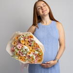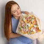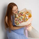 Букет красивый получился. Доставили немного позже назначенного времени, не критично для нас это было. Фото отчет сделали быстро. Доставка считаю дорогая, плюс большие розы не первой свежести были.