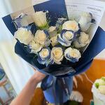 A captivating bouquet of white roses with hand-painted blue edges, symbolizing tranquility and elegance. Wrapped in deep blue tones and adorned with matching ribbons, this arrangement is a stunning expression of peace and sophistication. Azure Serenity is perfect for anniversaries, celebrations, or any occasion that calls for a unique and thoughtful gesture.